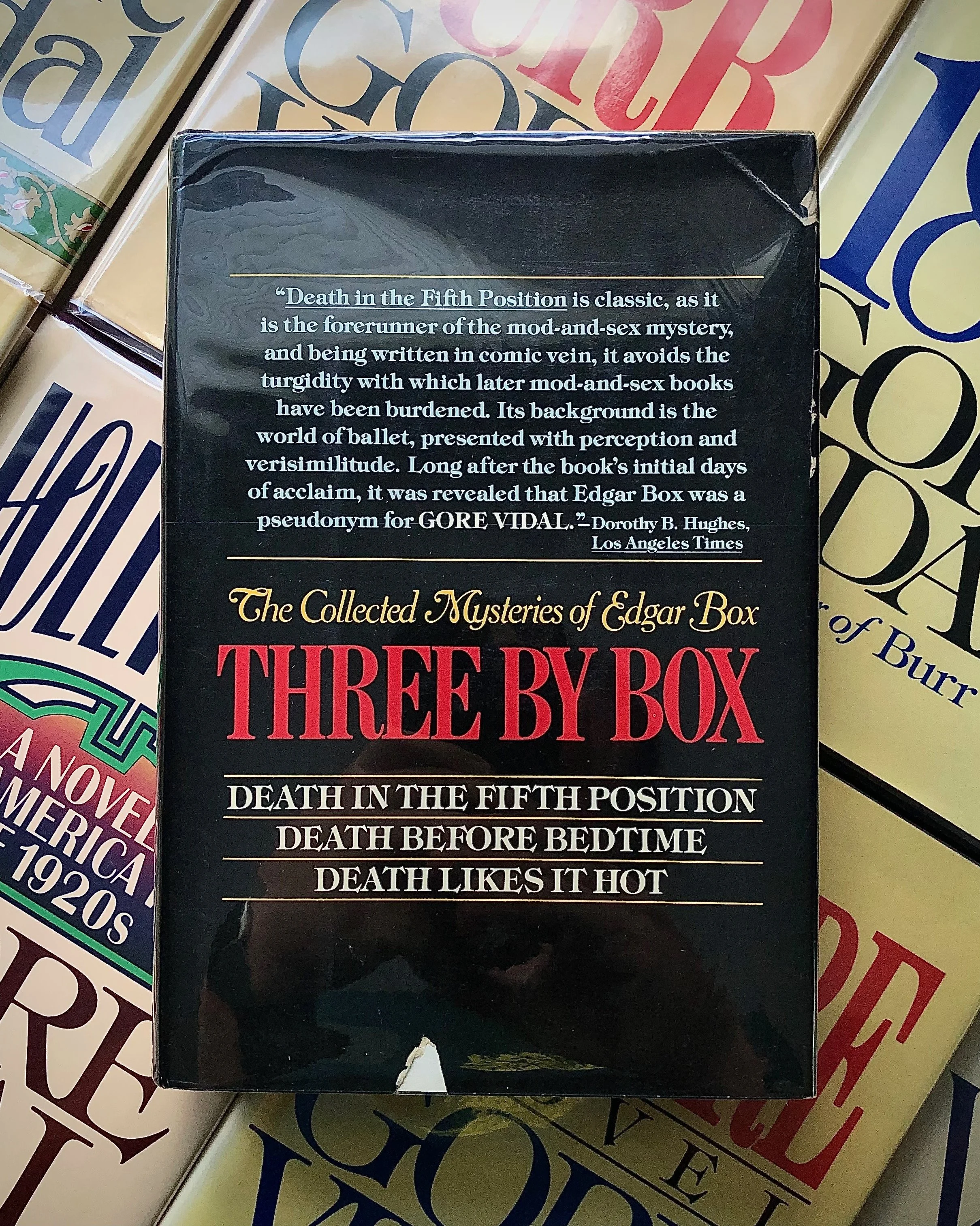 Intrigued by the idea and having known many of the tropes of the genre as a reader of Agatha Christie, Vidal assumed the name “Edgar Box” (a combination of Edgar Wallace, the godfather of the modern mystery tale, and the last name of an acquaintance) and wrote three mystery novels in a short clip: Death in the Fifth Position (1952), Death Before Bedtime (1953), and Death Likes it Hot (1954). Photo by the author.